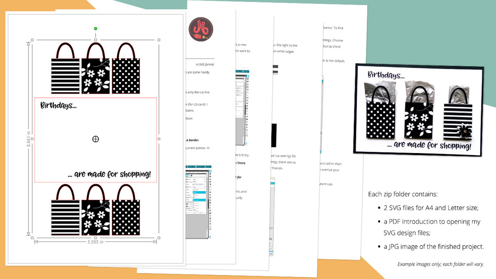 You will get: 2 SVG files for A4 and US Letter sizes; a PDF intro to opening my SVG designs; a JPG of the finished project; commercial use license for 250 cards.